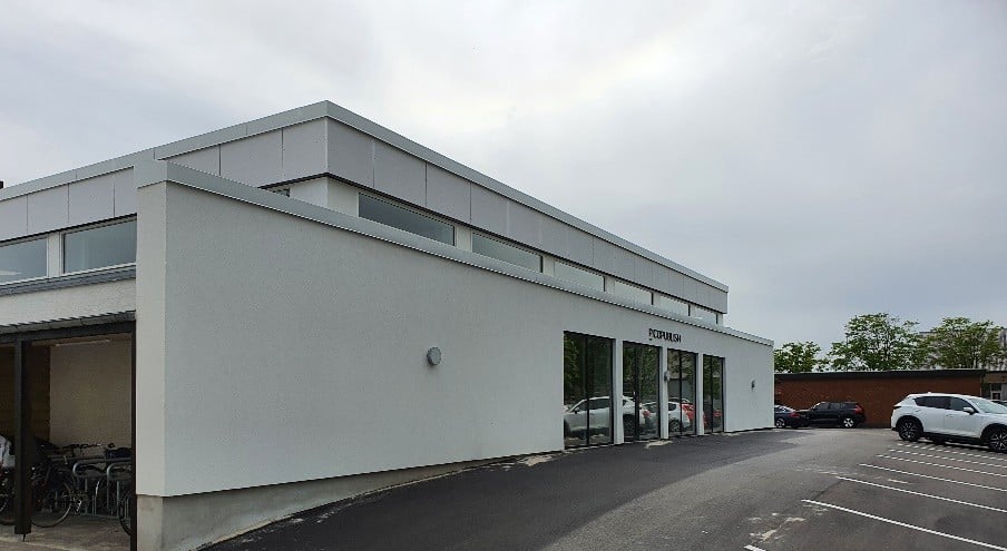 Ny tagbelægning af tagpap, incl. efterisolering. Nye nordvendte sheettags ovenlys. Eksist. facader er efterisoleret og pudset.